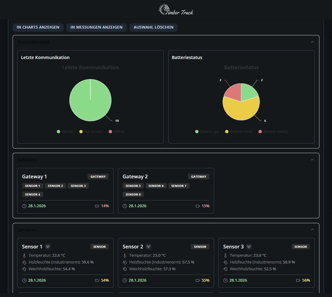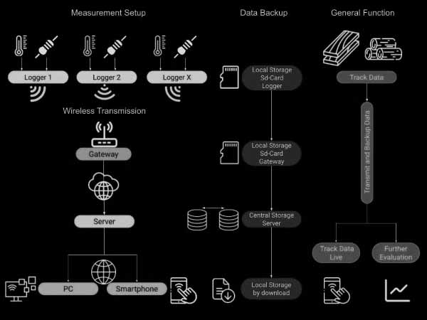 Die Daten werden auf einer SD-Karte im TimberTrack Logger zwischengespeichert. Optional können ein oder mehrere Logger (auch UniTrack und TempTrack ) kabellos mit dem TimberTrack Gateway verbunden werden, welches es erlaubt die Messdaten aller zugeordneten Logger auf einer SD-Karte im TimberTrack Gateway zu sammeln und diese gebündelt in eine Online-Datenbank übermittelt.