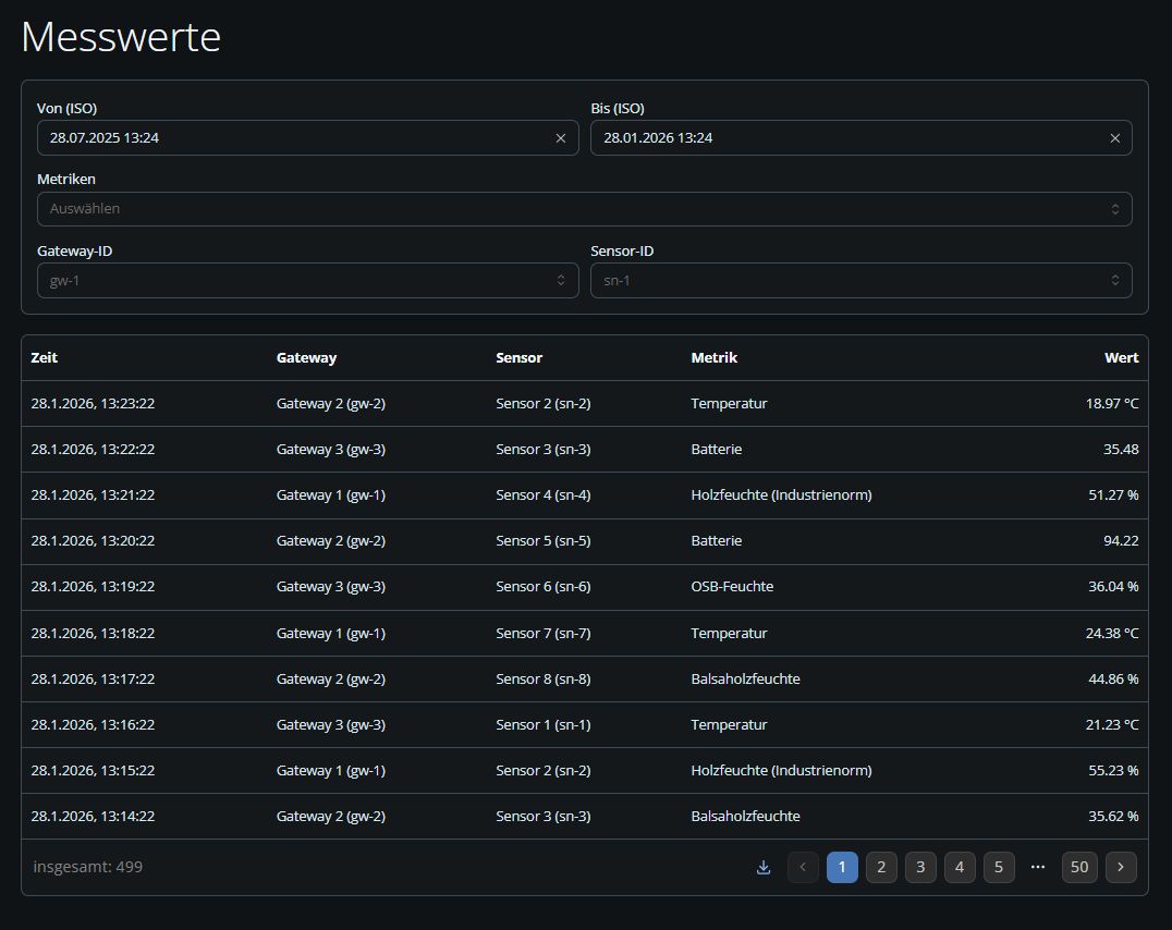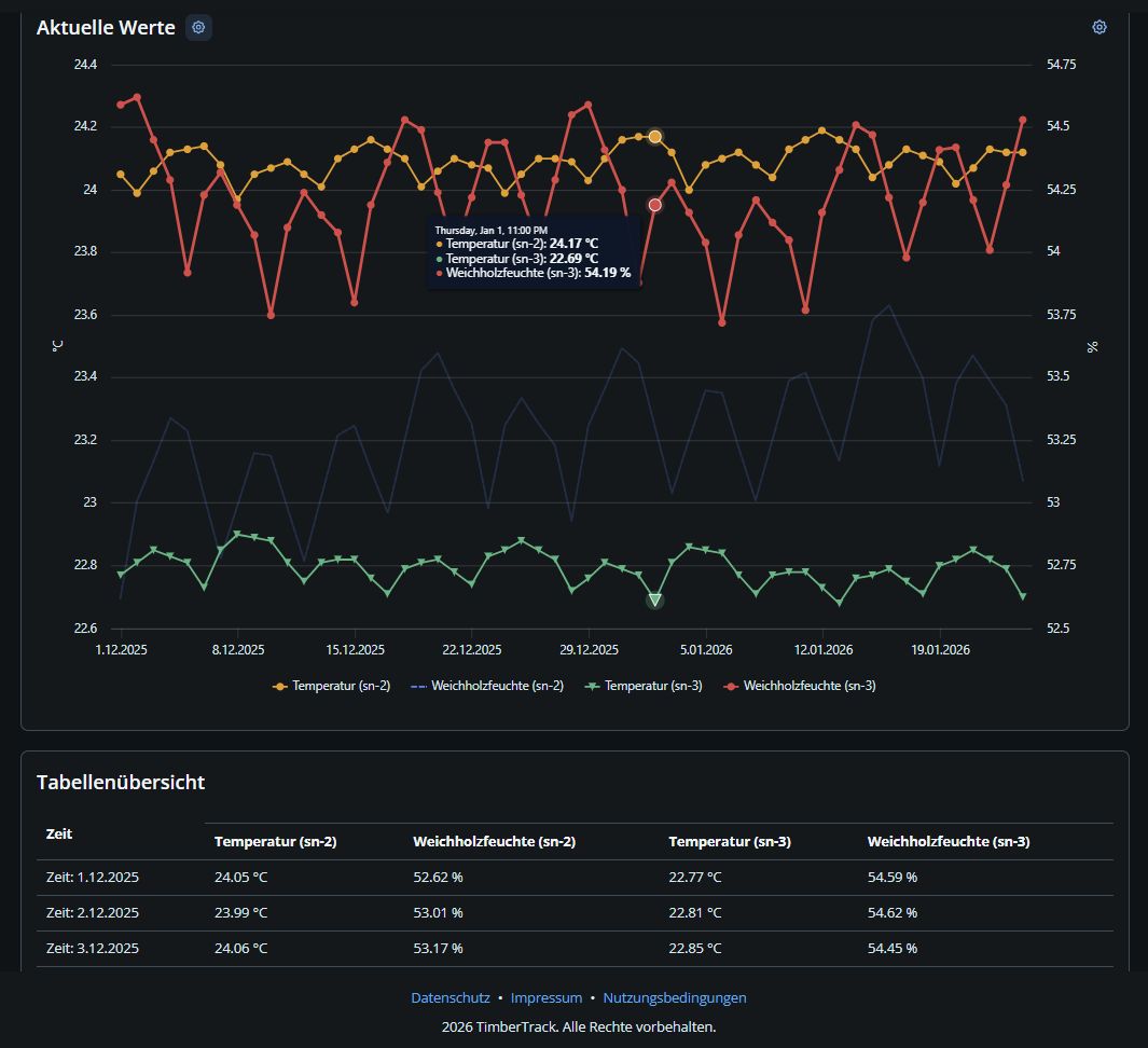 Die Messdaten können über die Cloudumgebung jederzeit live verfolgt und überwacht werden, wobei sie direkt im Browser visualisiert werden können. Dies ermöglicht eine schnelle Reaktion bei Schwankungen der Messdaten oder beim Erreichen bestimmter Feuchtegehalte. Für weiterführende Analysen können die Daten aus der Cloud auch jederzeit als .csv Dateien heruntergeladen werden.